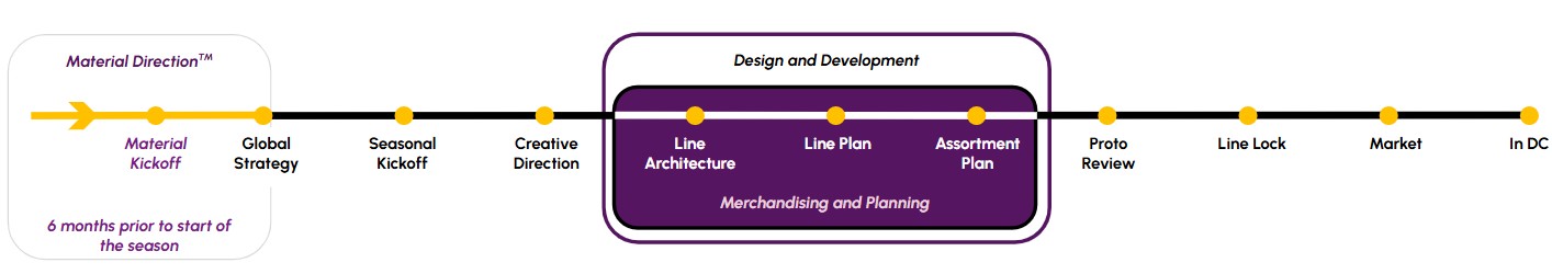 There is another layer of complexity to consider. The concept to market (a.k.a. go to market) calendar outlines the time needed to design, assort, produce and ship products to a distribution center or store. The calendar marks crucial decision-making moments. It is common for brands to have overlapping calendars. Meaning, teams are working on more than one season at a time.